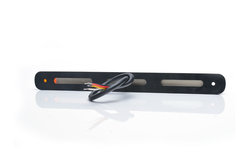 The W232 is a rear lamp with three functions: position, stop and indicator. The centre of the lamp is crossed by a line of LEDs that act as direction indicator, while the outer LED lines act as the rear position and brake light. When braking, the red position light is visibly illuminated, moving smoothly from the position light function to the stop function. This lamp is also available with the dynamic indicator - W232DD.